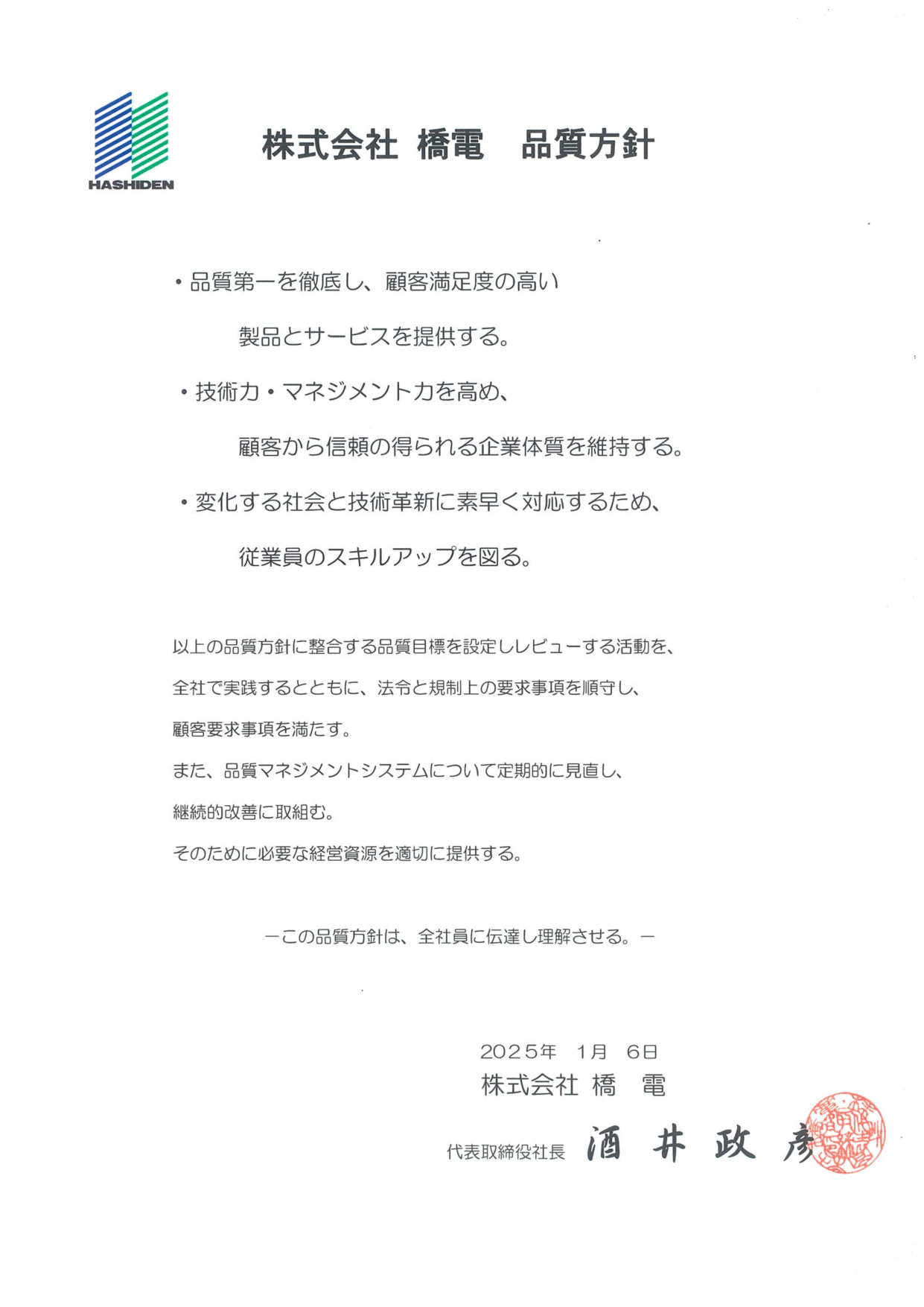 品質第一主義を掲げる橋電が、品質マネジメントシステムであるISO9000シリーズを取得したのは1994年のこと。業界内の事業規模で見れば、先進的な取り組みでした。以来、品質維持・向上の手段として有効に運営しています。その推進母体として「品質保証委員会」を設置しているほか、2005年には社内の教育システムとも連動する形でQCサークル活動を導入。さらに、「品質手帳」や「品質新聞」の発行を行うなど、独自の品質管理体制を構築しています。